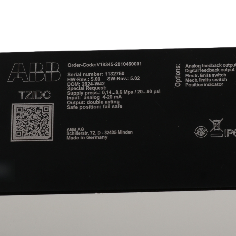 The ABB V18345.20.2.1.4.6.1.00.1-V5 is a high-performance digital positioner belonging to ABB's TZIDC series. It utilizes advanced digital HART communication technology and supports multiple communication protocols.