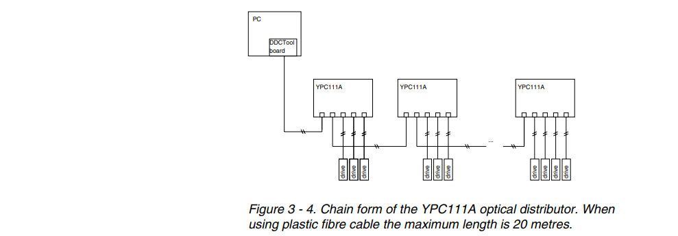 If there are several DDCs and only one PC, YPC111A optical distributors can be used between the DDCTool board and the DDCs. YPC111A has one connection for the DDCTool board and four connections for the DDCs or lower level optical distributors. When using the YPC111A board and plastic fibre cable, the maximum length between the boards is 20 metres.