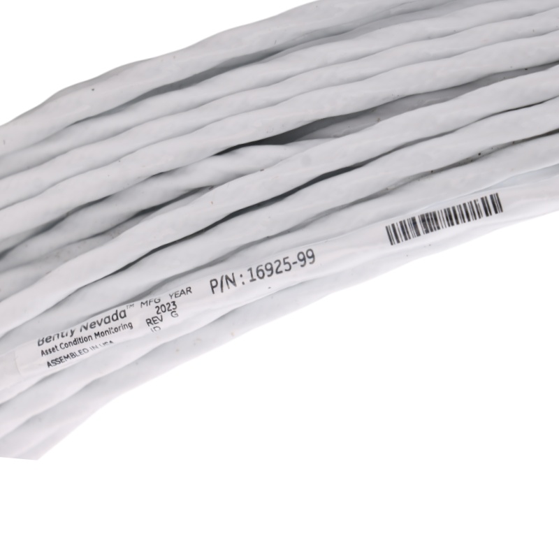 The Bently Nevada 16925-99 Interconnect Cable is a 3-conductor shielded 22 AWG (0.5 mm²) cable. It features a 3-socket plug at one end and terminal lugs at the other, allowing flexible and secure connections between sensors and monitoring equipment. This cable has a total length of 99 feet (30.17 meters), providing ample reach for complex installations while maintaining signal integrity.