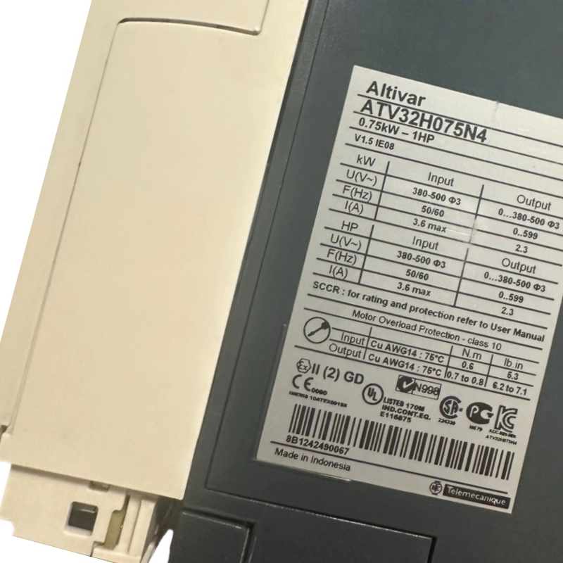 The Schneider ATV32H075N4 variable speed drive supports motors with a power of 0.75 kW at 380–480 V.