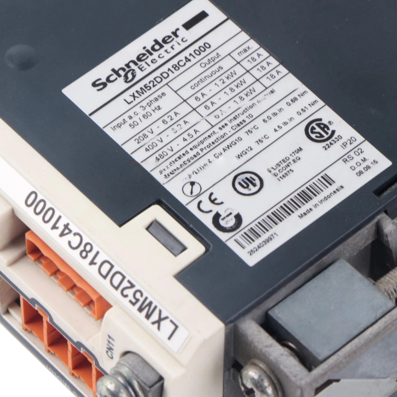 The Schneider LXM52DD18C41000 single drive supports three-phase operation.